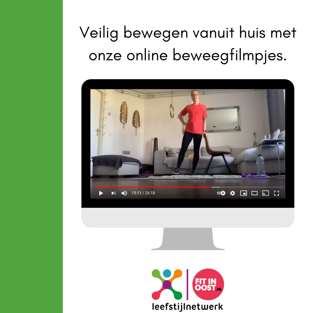 Voor de mensen die wel graag willen bewegen, maar dit liever vanuit huis willen/moeten doen, hebben we de online beweegfilmpjes. De filmpjes zijn gemaakt door sportleiders uit Oost en zijn te vinden via ons YouTubekanaal ‘Fit in Oost’.
