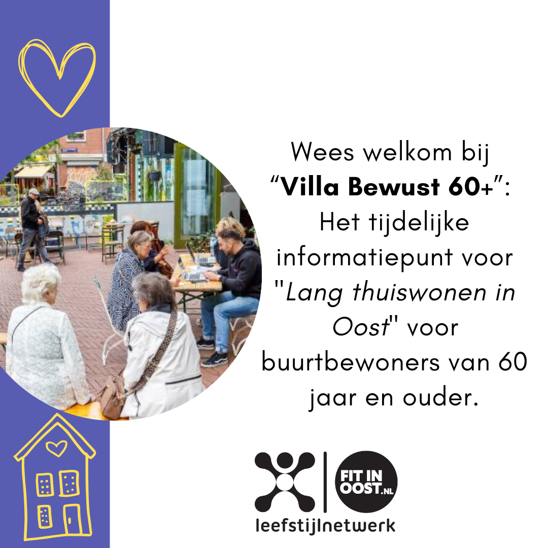 “Villa Bewust 60+” is het tijdelijke informatiepunt voor “Lang thuiswonen in Oost” voor buurtbewoners van 60 jaar en ouder. Kom langs en: