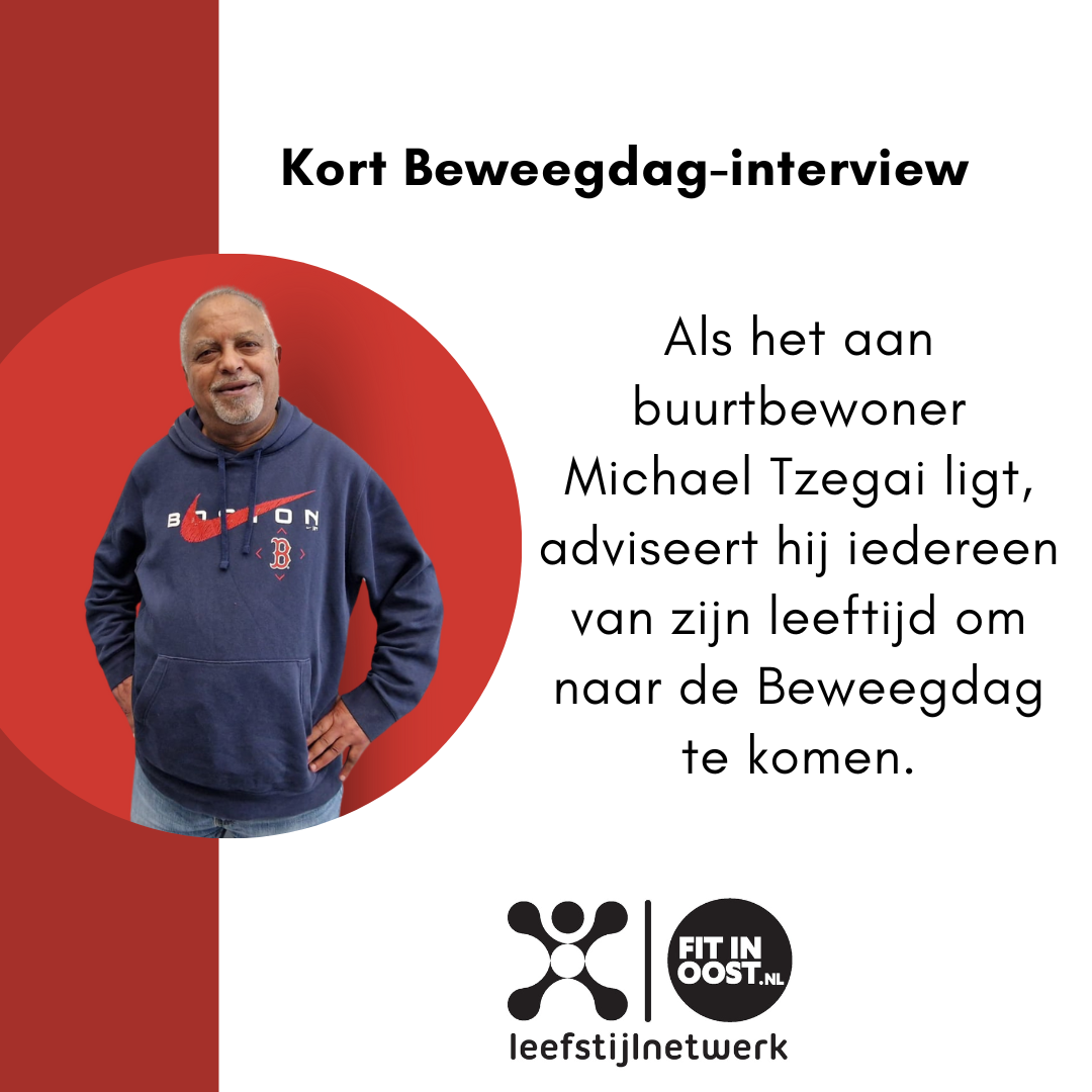 De boodschap die Michael zou geven aan anderen als hij hen mocht uitnodigen om deel te nemen aan de dag: ‘Ik ga advies geven aan mensen van mijn leeftijd. Voor mensen van mijn leeftijd is dit echt heel belangrijk. Voor jonge mensen ook, maar voor mensen van 50+ en 60+ al helemaal. Toen ik de fit test voor het eerst deed, was ik helemaal zwak. Maar na bouwen en bouwen met bewegen ben ik sterker geworden.’