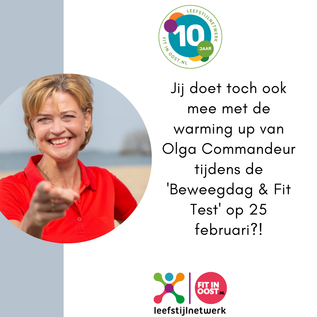Yes! We zijn blij, want we mogen jullie weer uitnodigen voor de eerste ‘Beweegdag & Fit Test’ van 2022! En omdat we dit jaar ons 10-jarig jubileum vieren, hebben we tijdens deze beweegdag niemand minder dan Olga Commandeur uitgenodigd om de warming up te komen verzorgen. Meld je snel aan en zorg dat je dit niet mist!