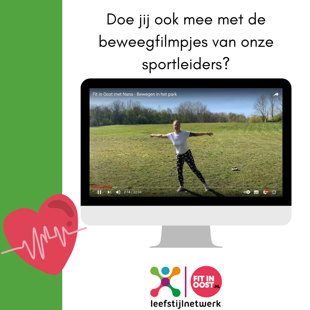 Gelukkig mogen we sinds maart weer in kleine groepjes samen buiten sporten*, maar we kunnen ons ook heel goed voorstellen dat dat nog lang niet voor iedereen prettig voelt. Daarom blijven we vanuit het Leefstijlnetwerk onze online beweegfilmpjes met sportleiders uit Oost maken en onder de aandacht brengen. De beweegoefeningen zijn over het algemeen zonder materiaal en op je eigen niveau uit te voeren, zowel binnen als buiten. Zo hopen we je te kunnen ondersteunen in je beweegroutine!