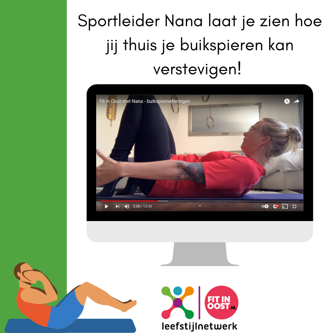 Gelukkig kan je via ons YouTubekanaal leuke beweegfilmpjes voor thuis bekijken. Sportleiders uit Oost laten je oefeningen voor diverse spieren zien die allemaal gemakkelijk vanuit je eigen woonkamer uit te voeren zijn. Neem bijvoorbeeld het beweegfilmpje van sportleider Nana, ditmaal met buikspieroefeningen.