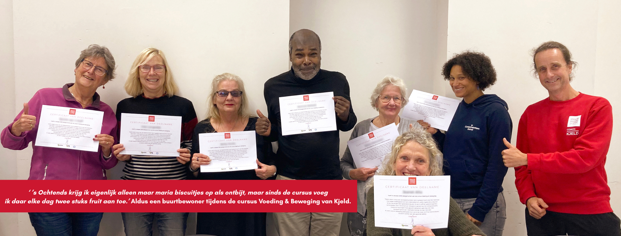 Bij aankomst was één ding gelijk duidelijk: De sfeer zat er bij de deelnemers goed in! Zo werden onder andere de huiswerkoefeningen besproken wat direct zorgde voor mooie gesprekken in de groep. ‘Ik krijg ’s ochtends eigenlijk nooit meer dan drie mariabiscuitjes op als ontbijt. Maar sinds de cursus probeer ik daar toch twee stuks fruit aan toe te voegen.’ Aldus een deelnemer. Op de vraag van Kjeld welke beweegmomenten de deelnemers gedurende hun dag inbouwen worden uiteenlopende antwoorden gedeeld. Van traplopen, wandelen en tuinieren tot aan meedoen met Nederland in Beweging en een beweegclubje in eigen wijk.