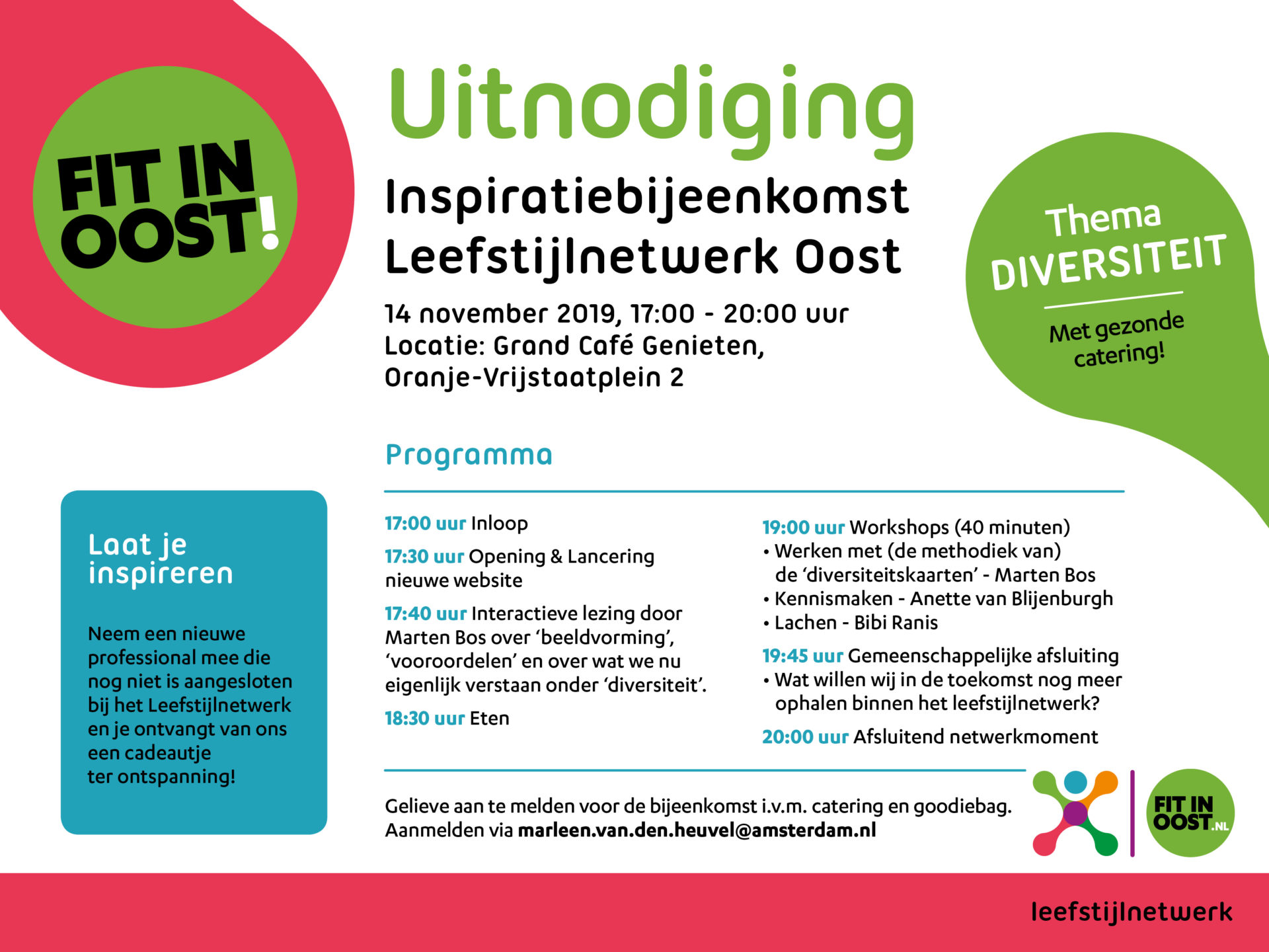 Ben jij actief als professional (betaald of onbetaald) in Amsterdam Oost op het gebied van een gezonde leefstijl? Wil je graag weten wie er nog meer in Oost actief zijn op dit gebied en heb je zin in nieuwe inspiratie? Kom dan naar de inspiratiebijeenkomst van het Leefstijlnetwerk op donderdag 14 november in Grand Café Genieten!
