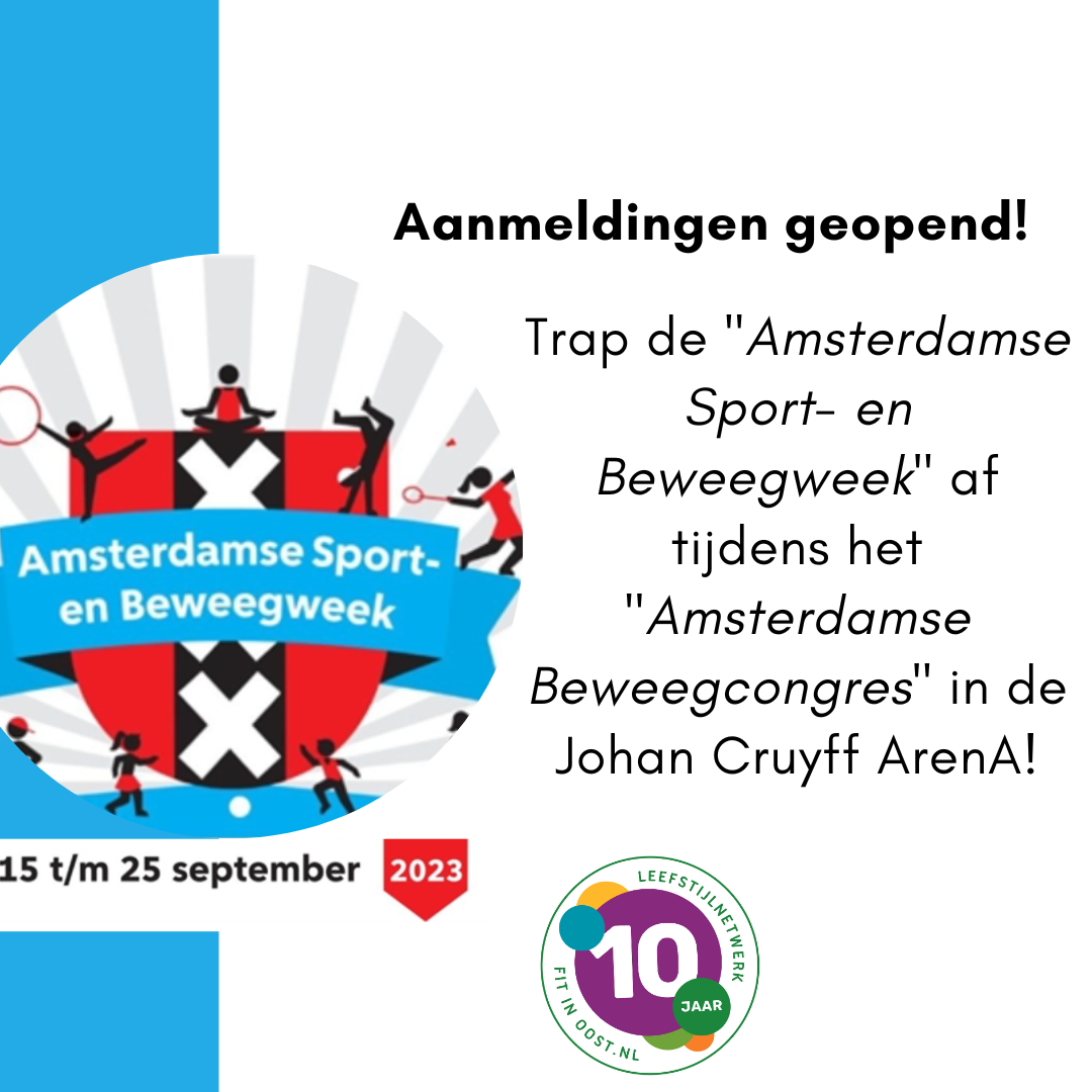 Ben jij sport- en beweegaanbieder of zet jij je op een andere manier als (vrijwillige) professional in op het gebied van een gezonde leefstijl? Dan is het Amsterdamse Beweegcongres interessant voor jou! Meer informatie lezen over het programma van de Amsterdamse Sport- en Beweegweek en je aanmelden voor o.a het Beweegcongres en overige programmering kan via deze link.