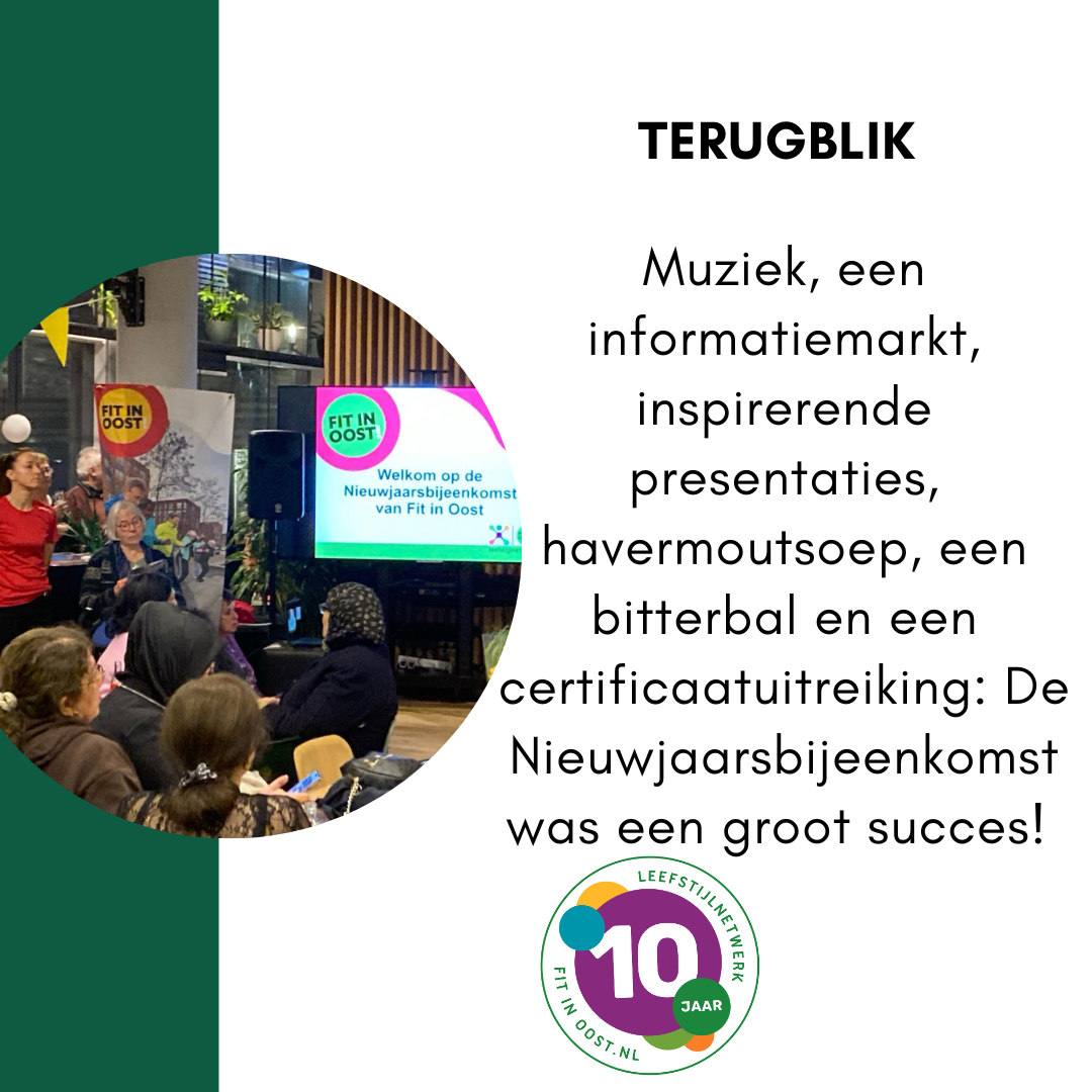 De jaarlijkse “Fit in Oost Nieuwjaarsbijeenkomst” was niet alleen drukbezocht en gezellig, maar ook inspirerend, verbindend en informatief. Zo sprak onze stadsdeelvoorzitter Carolien de Heer haar dank en waardering uit over het netwerk. Naast dat geen enkel ander stadsdeel een netwerk heeft zoals het Leefstijlnetwerk (en dat dus iets is om trots op te mogen zijn!), aldus Carolien, heeft het netwerk haar zelf ook geïnspireerd om meer in beweging te komen. Zo plant zij nu bijvoorbeeld met regelmaat wandeloverleggen in in plaats van zittende vergaderingen op een kantoor en sport zij mee met een groep in Oost. Samen bewegen werkt immers soms motiverender dan alleen!